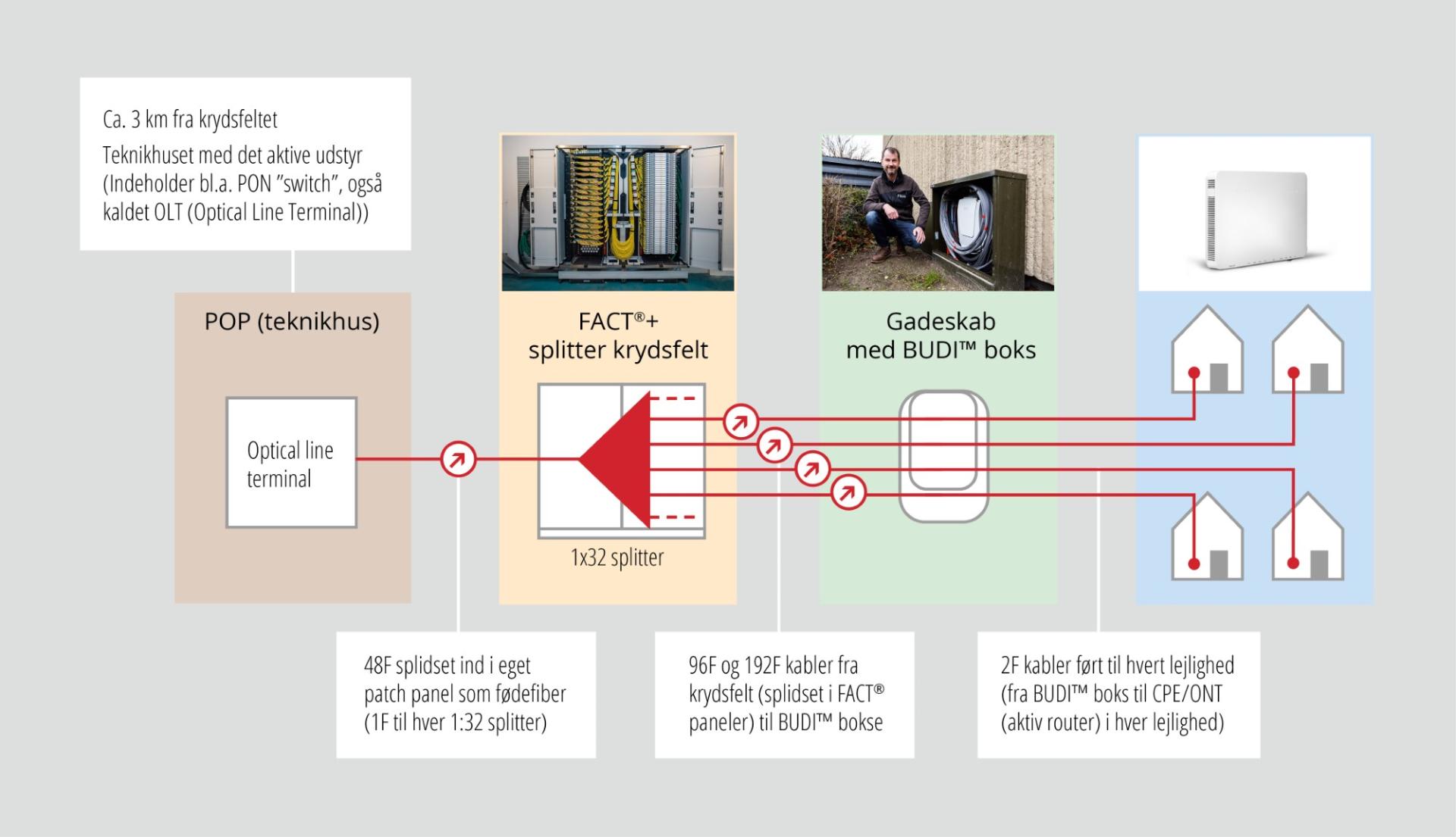 I krydsfeltets FACT®-skuffer er patch-kablerne termineret mod 96F- og 192F-fiberkabler, som går ud til de i alt ca. to x 30 gadeskabe, hvor signalerne fra de større fiberkabler igen bliver ført ud via 2F-kabler (1+N redundans) til en aktiv router (CPE/ONT) i hvert lejemål.