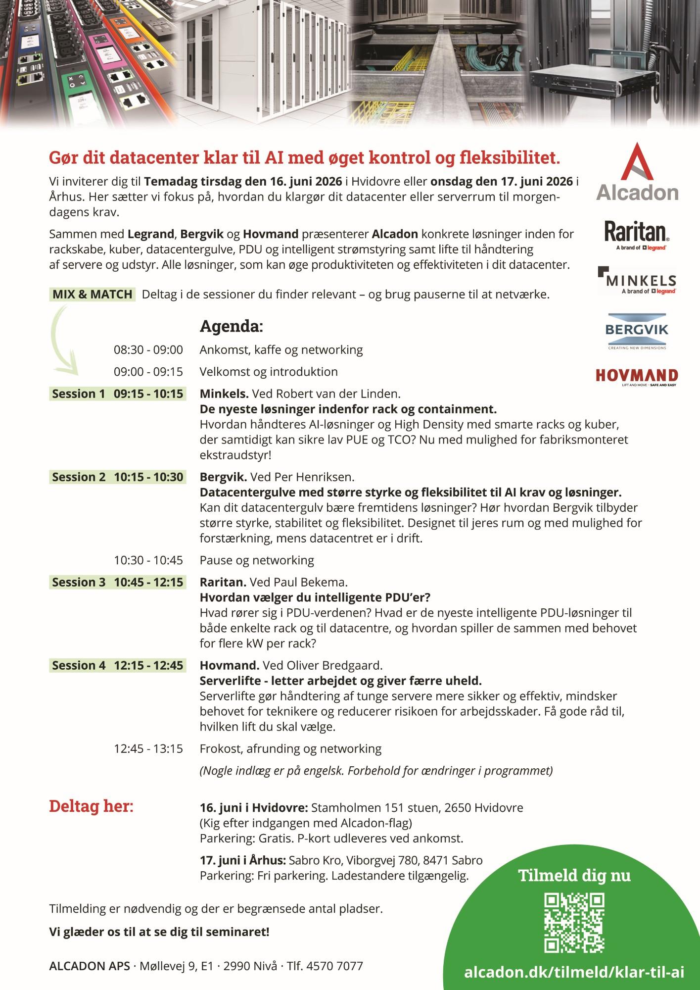 På denne temadag viser Alcadon sammen med Legrand, Minkels, Bergvik, Raritan og Hovmand konkrete løsninger til fremtidens datacenter. Du får indsigt i rackskabe, containment, datacentergulve, intelligente PDU’er, strømstyring og serverlifte – og hvordan de enkelte løsninger kan spille sammen i praksis.